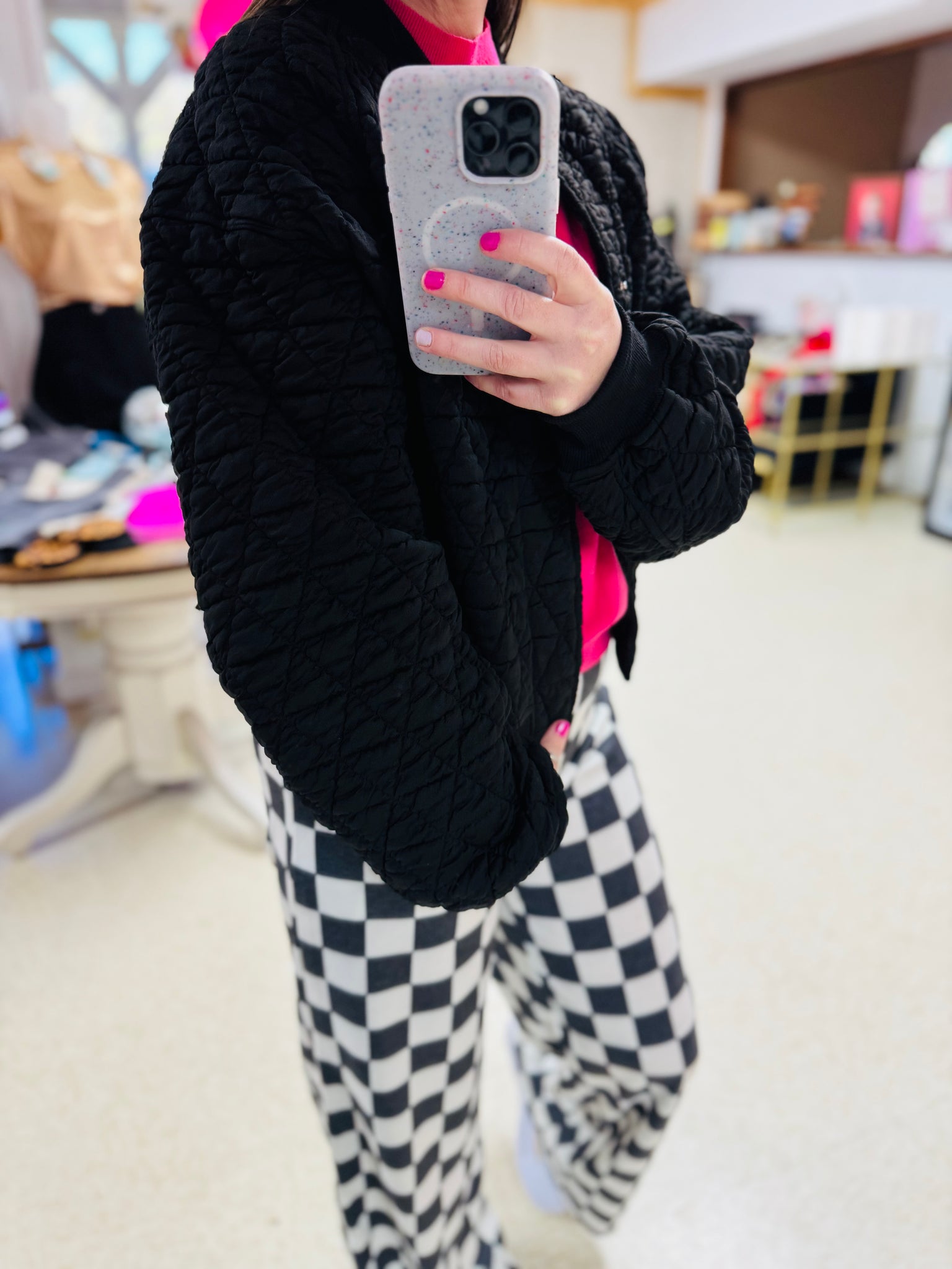 Up your style game with the Daphnee Bomber Jacket! This black jacket features a unique triangle quilted stitch knit, giving it an edgy yet chic look. Perfect for any outfit, it's a must-have addition to your wardrobe. Stay warm and fashionable in the Daphnee Bomber Jacket. (P.S. This jacket is not your average bomber!)