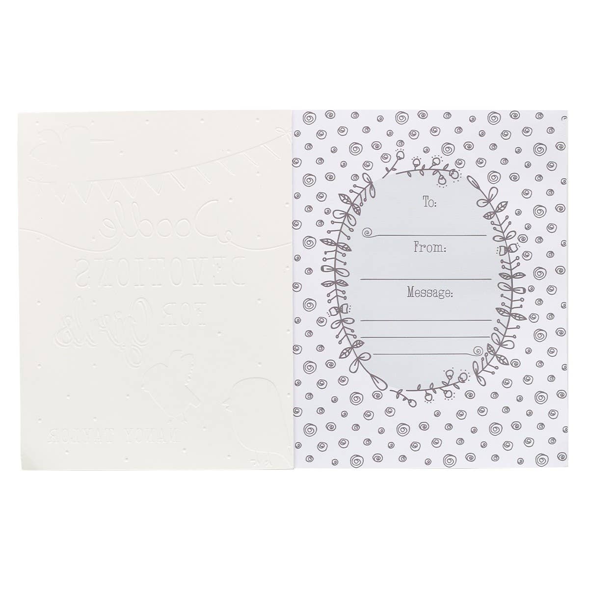 Cute doodle drawing cover design, UV varnish, Black text with pink and white shadow line, Doodle Devotions for Girls, Flexcover, Thick paper, Presentation page, One-color interior, Suitable for preteens and teens, Ages: 13 and Up, 60 devotions, 152 pages, Size: 8.3" x 6.8" x 0.6" (211 x 173 x 15mm)