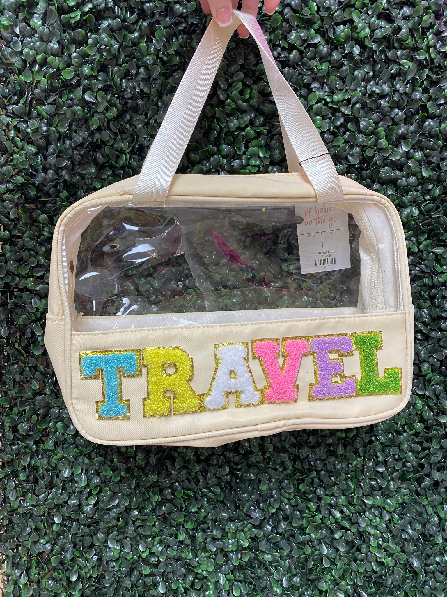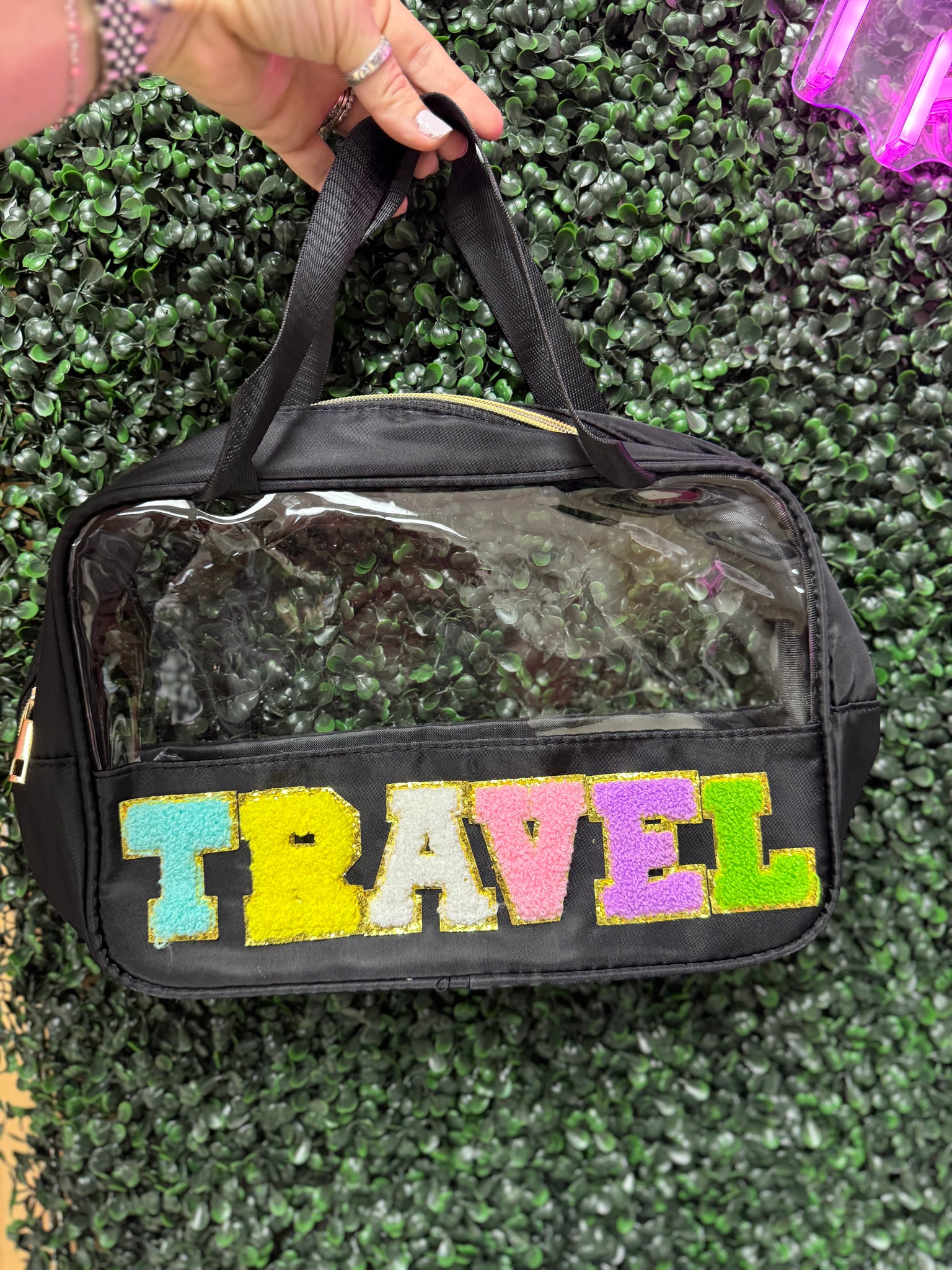 "Get ready to jet set with our Travel Bag! This clear chenille letter bag measures 7x3x11, perfect for bringing all your essentials on the go. With a playful twist on traditional travel bags, you'll be sure to stand out in the crowd. (Fits within airline carry-on size limitations!)"