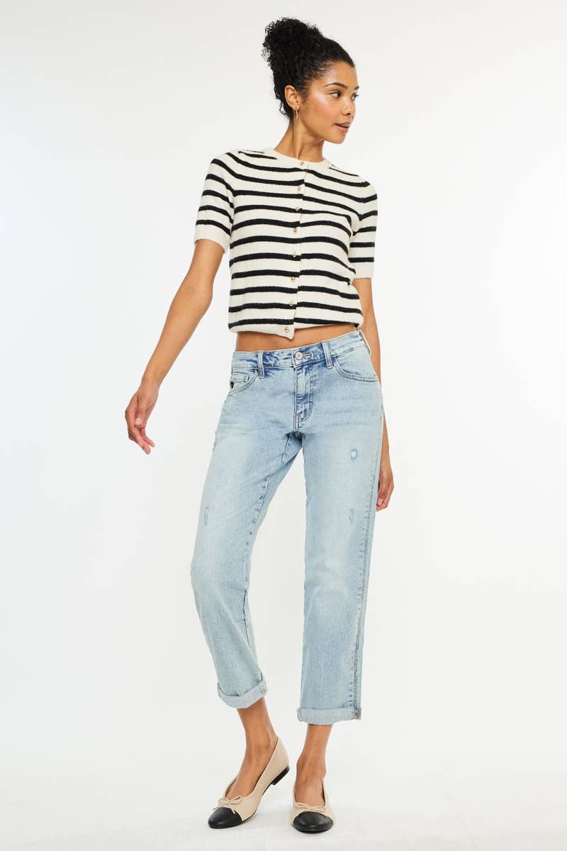 MID RISE SLIM BOYFRIEND JEANS LIGHT WASH COMFORT STRETCH TRIPLE NEEDLE ON SIDE SEAM DOUBLE 1” CUFF AT BOTTOM HEM ZIPPER FLY SIDE SEAM PANEL DETAIL RISE 9 1/2 INSEAM 27 IN SIZE 5/26 98% COTTON, 2% SPANDEX 12.9 OZ