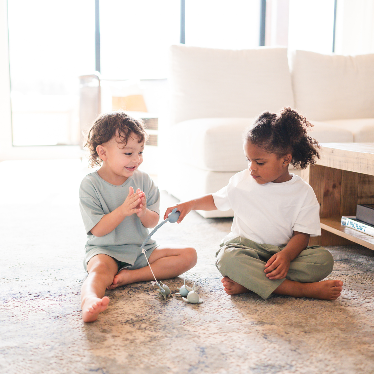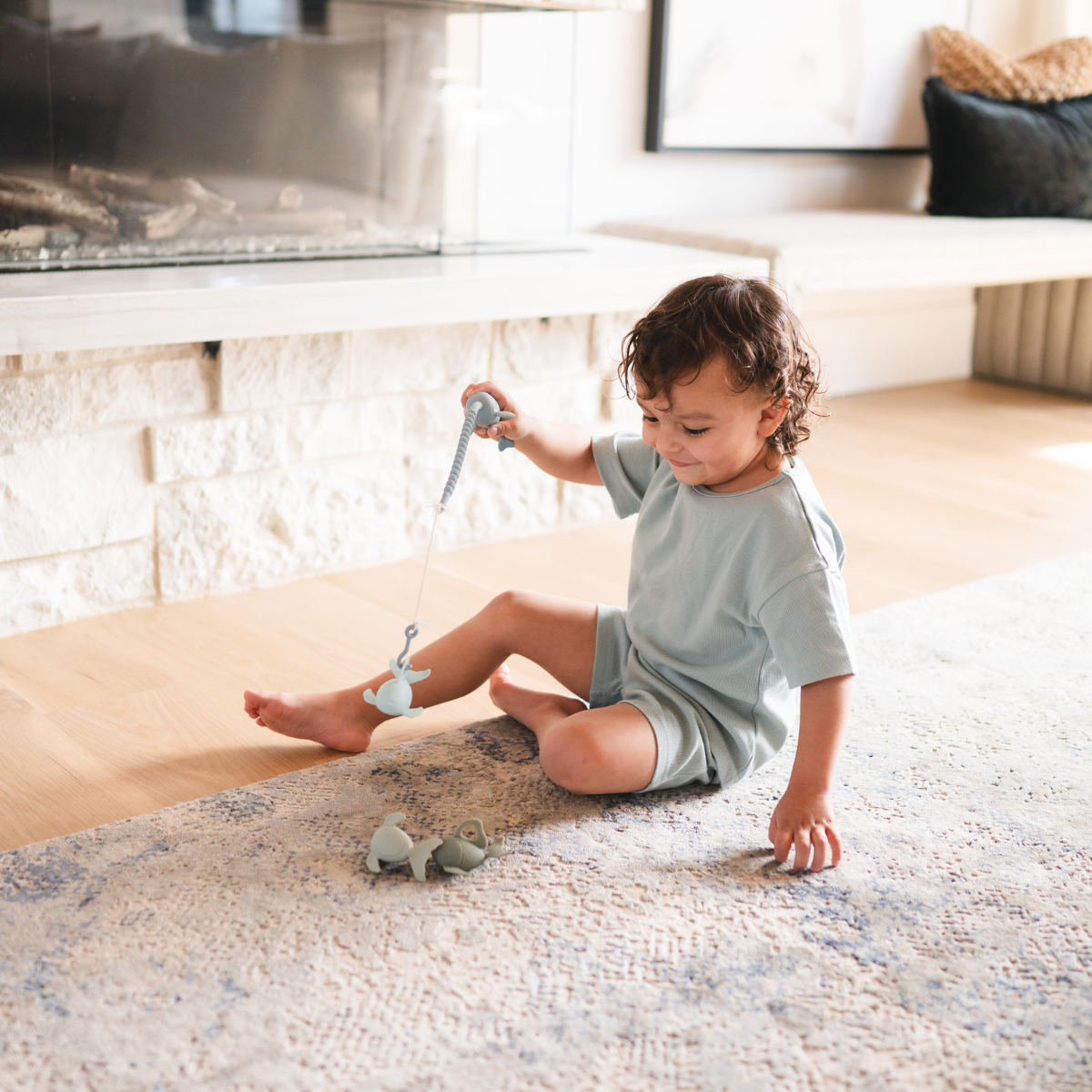 Our Silicone Fishing Playset is designed with your little one's development and your aesthetic in mind. Crafted for families who value both style and substance, this chic bath toy is perfect for parents who seek to enrich their child’s playtime with products that are as visually appealing as they are educational. This set includes a sleek fishing rod and three colorful fish, each crafted from high-quality silicone. It's the perfect blend of fun and functionality, designed to captivate your child’s attention while promoting key skills. Benefits include promoting coordination and gross motor skills, enhances concentration and encourages language and communication. Packaged in a gift box. Ages:  3y+ Dimensions: Pole 16 inches x 2 inches x 1.25 inches Fish 2.75 inches x 2.38 inches x 2 inches