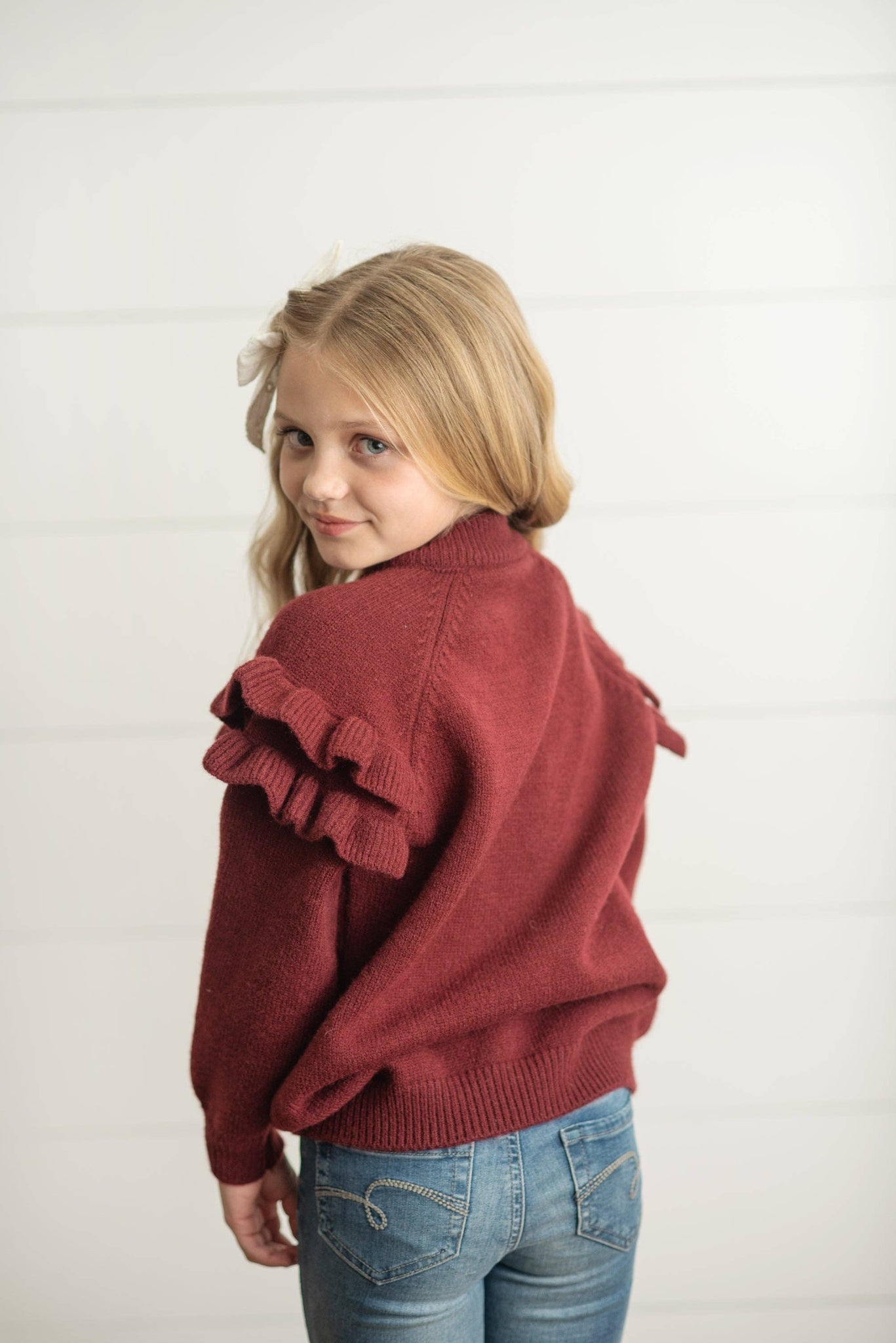 Girls burgundy wine colored crew neck pullover sweater with double ruffle details. Style it dozens of ways for back to school in the Fall & Winter or fun holiday vibes!
