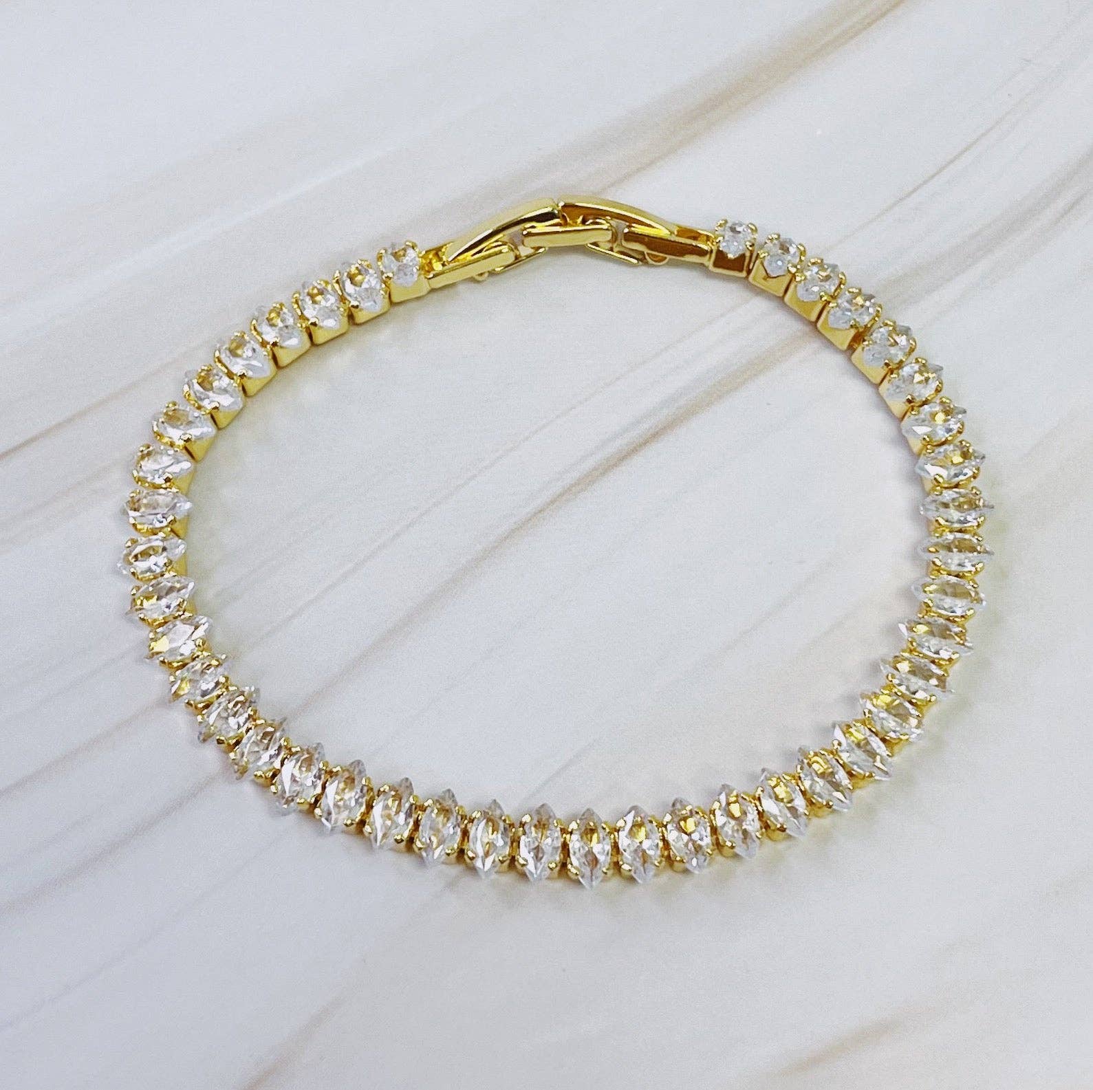 Add a touch of elegance to your wrist with our Marquise Cut Sparkle Tennis Bracelet. The beautiful marquise cut design and an alluring sparkle will add a touch of luxury to any outfit. Elevate your style with this stunning piece. Dimensions: approximately 6.5" with snap closure, has an extra snap closure to adjust size 18k gold plated brass Lead and Nickel free Crafted in China