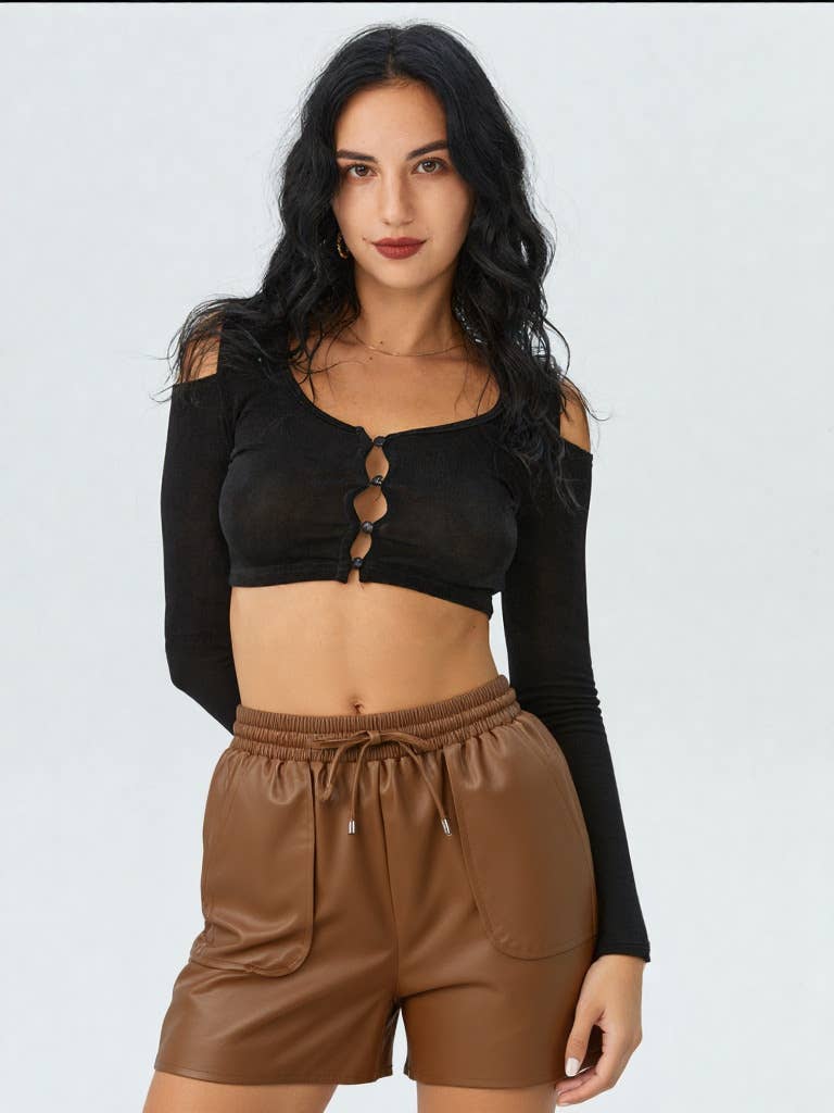 Solid Faux Leather Casual Dolphin Shorts - Side Pockets - Round Hem - Elastic Waist - Oversized
