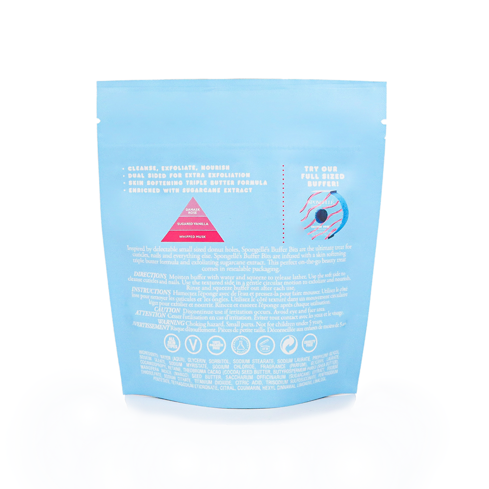 Inspired by delectable tiny donut holes, our mini Buffer Bits in feminine Chiffon Rose are a sweet extension of our skin-nourishing Confection Buffers. This adorable, dual-sided buffer is the perfect size for precise deep-cleansing and softening of cuticles, nails, and small dry patches. It features special soft cleansing on one side and gentle textured exfoliation on the other. Infused with skin-softening triple butter and exfoliating sugarcane extract, you'll love the seductive fragrance combination of sensual Damask rose, soothing sugared vanilla, and creamy whipped musk.