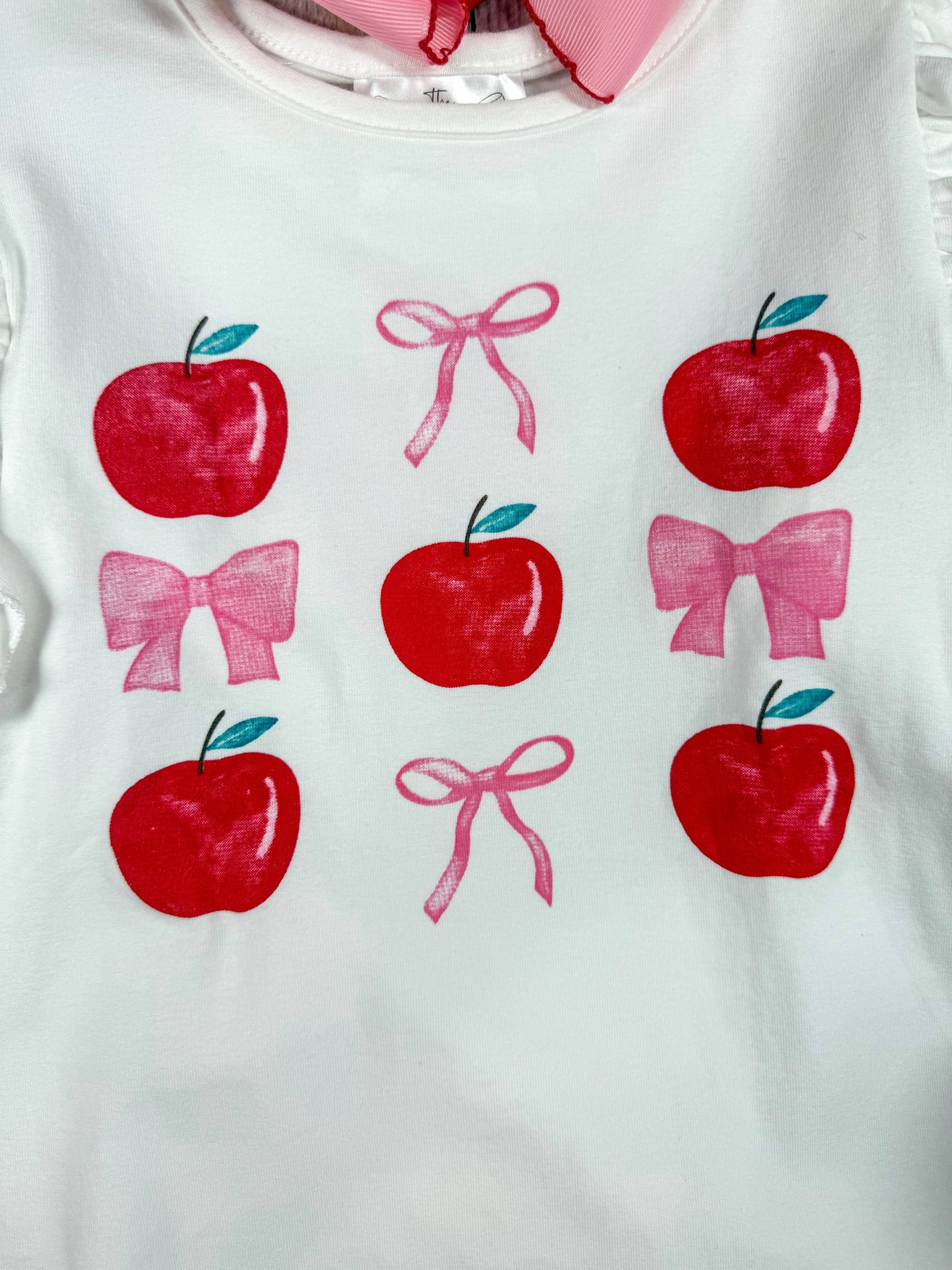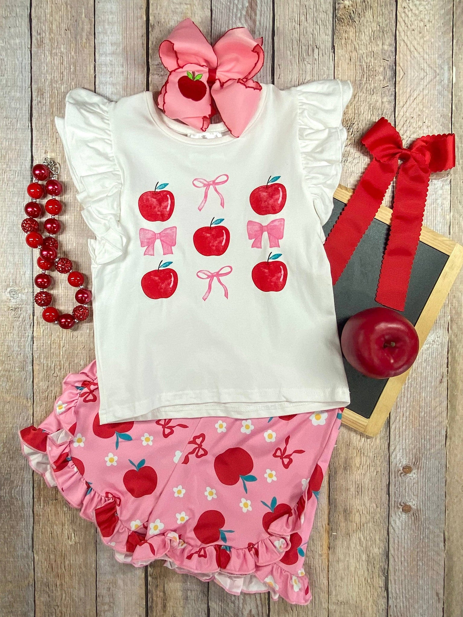 Get ready for the new school year with the Apples & Bows Pink Ruffled Shorts Set! This playful outfit features soft pink shorts with adorable ruffles, perfect for keeping your little one comfy and stylish from classroom to playground. A fun and fresh choice to brighten up back-to-school days! Accessories not included. Materials: 70% Cotton 25% Polyester 5% Spandex